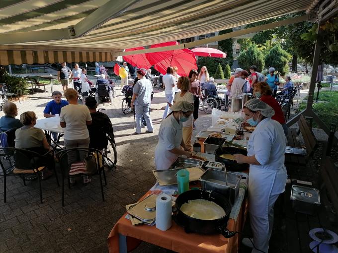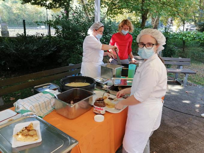 Vsi skupaj smo po zaključenem gibanju, prišli na cilj v domski park, kjer smo se lahko posladkali z palačinkami, ki so jih pripravili v naši kuhinji.