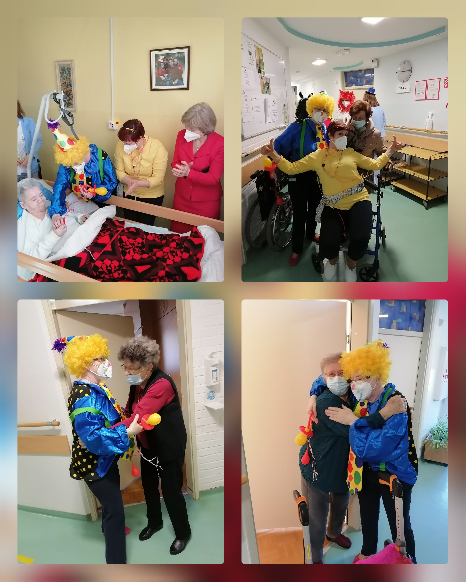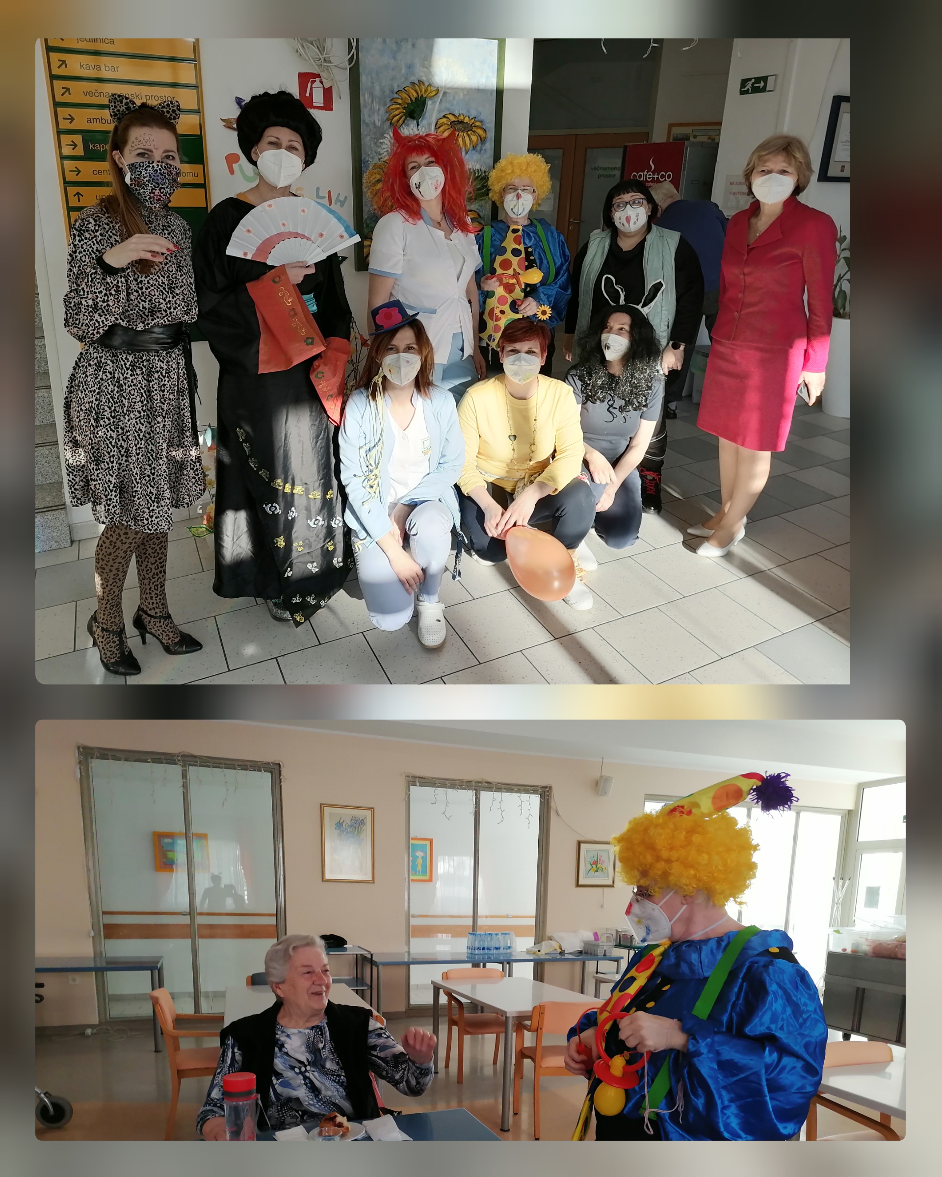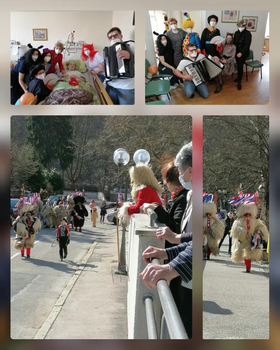 Veseli smo, da smo lahko s skupino mask in harmoniko pričarali malo pustnega vzdušja v jedilnici in nato po nadstropjih. Ob 12 uri nas je pred Domom ob Savinji obiskala skupina Kurentov.