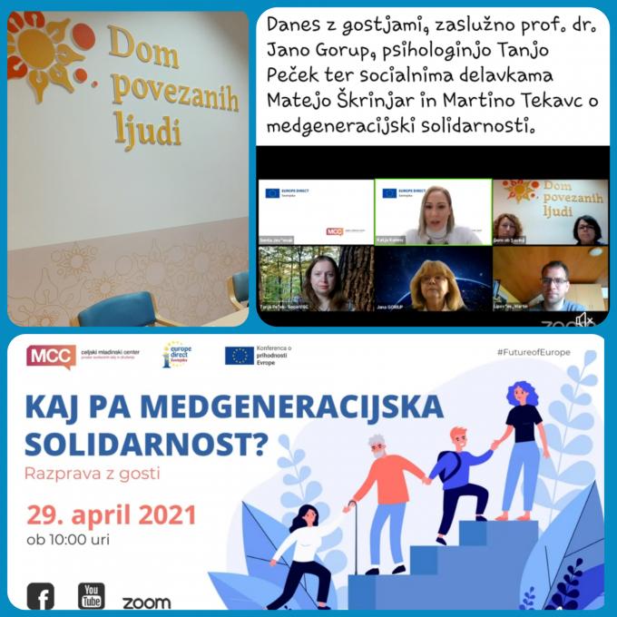 Mladinski center Celje je v četrtek, 29. aprila 2021, v duhu Evropskega dneva solidarnosti organiziral spletno razpravo z naslovom Kaj pa medgeneracijska solidarnost?